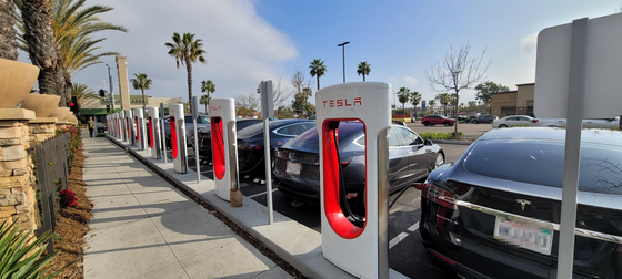 개스값이 천정부지로 치솟으면서 전기차 수요는 급증하고 있으나 로컬의 공공 전기차 충전기는 턱없이 부족한 것으로 드러났다. 사진은 콘보이 한인타운 인근 발보아 메사 쇼핑센터에 설치돼 있는 테슬러 자동차 전용 충전소의 모습으로 연일 만원사례를 이루고 있다.