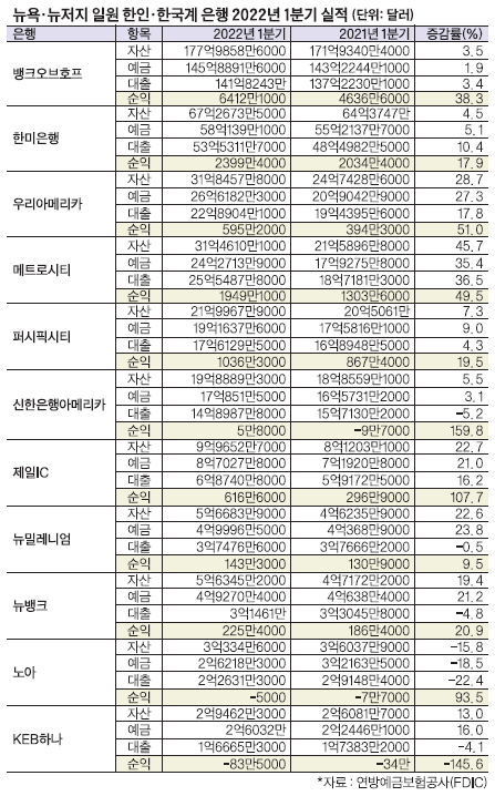 뉴욕과 뉴저지 일원에서 영업하는 한인·한국계 은행들이 지난해 사상최대 실적에 이어 올해 1분기에도 호실적을 냈다. 대부분 은행 순익이 전년동기 대비 두 자릿수 증가율을 기록한 가운데, 총 자산규모도 400억 달러에 육박하고 있다.