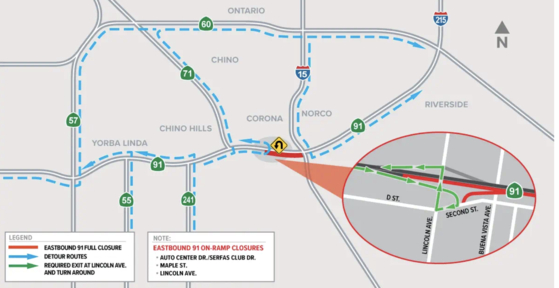 리버사이드카운티 교통위원회(RCTC) 아론 제이크 사무국장은 오렌지카운티나 LA카운티에서 동쪽으로 이동할 경우 운전자들에게 57번이나 71번 북쪽방면 우회로를 이용할 것을 권고했다.