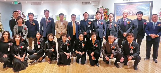 남가주사진작가협회(회장 김상동) 정기전시회가 15일 LA한국문화원(원장 정상원)에서 개막했다. 16회째인 이번 전시의 주제는 '대지의 풍요-아름다운 세상'으로 12명의 회원 작가들이 참여한 40여점의 다양한 사진작품이 오는 30일까지 전시된다. 15일 개막식에서 참여작가들과 축하객들이 기념사진을 찍고 있다. 김상진 기자