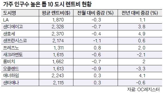 가주에서 인구수가 많은 톱 10 도시 중 지난 1월과 비교해 렌트비가 내린 곳은 7곳이었으며, 1년 전보다는 3곳만 떨어졌다.