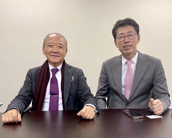 오는 30일 열리는 세계 한인 경제인 골프대회의 후원회장 조병태(왼쪽) 한상대회 리딩 CEO 포럼 공동의장과 한상대회 윤만 공동대회장이 한인 경제인들의 적극적인 동참을 부탁했다. 박낙희 기자
