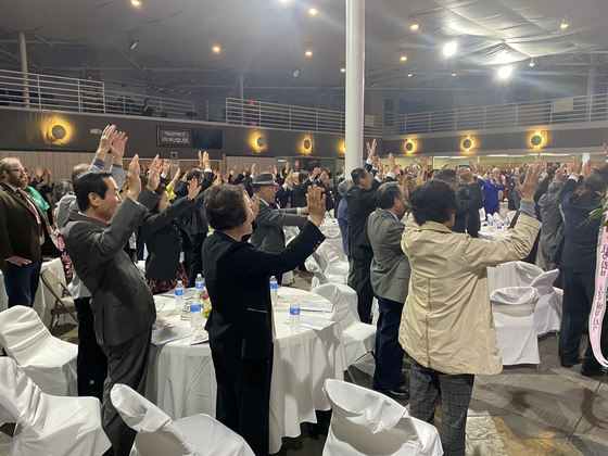 조중식 AKUS 상임고문의 구호에 맞춰 참석자들이 만세삼창을 부르고 있다.