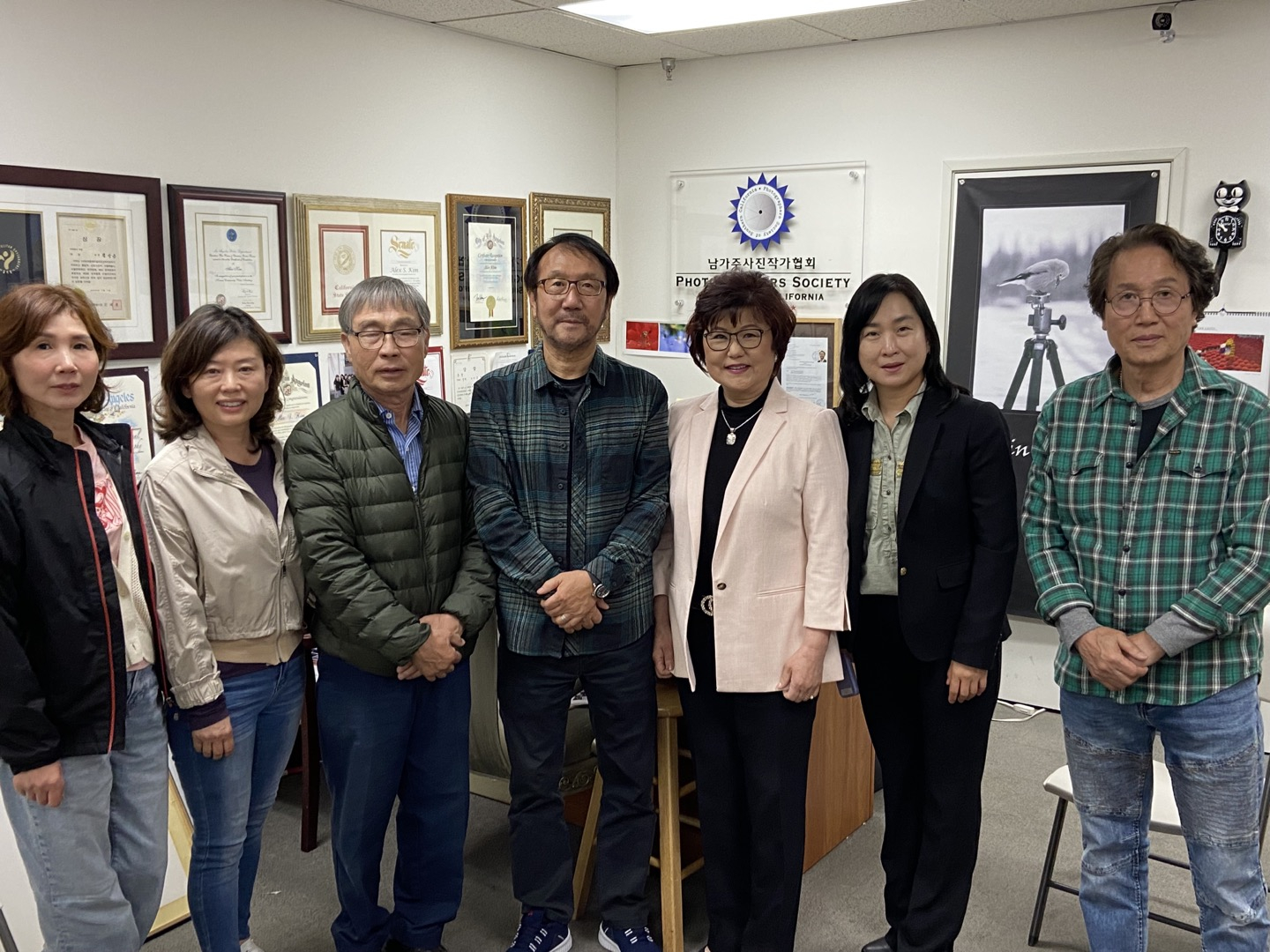 한미여성회(The KAWA·이사장 에스더 김)와 남가주사진작가협회(회장 김상동) 관계자들이 무료 영정사진 촬영 행사를 설명하고 있다. 왼쪽부터 남가주사진작가협회 임희빈, 이준천 김진선 회원, 김상동 회장, 한미여성회 에스더 김 이사장, 최지아 디렉터, 토머스 김 사진협 회원.