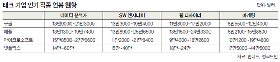 올해 대량 해고와 채용 동결을 한 빅테크 기업의 인기 직종 급여는 여전히 최고 수준으로 나타났다. 〈표 참조〉