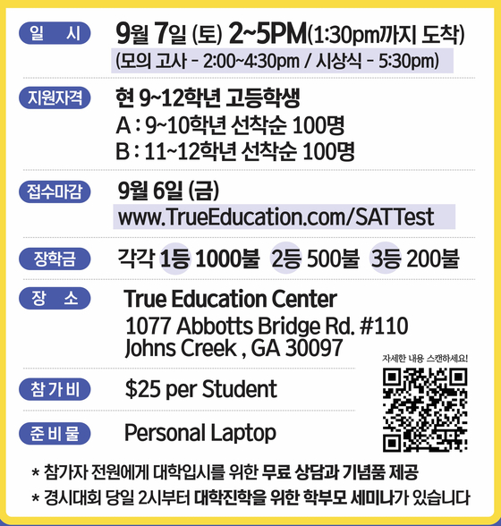 한인 고등학생을 위한 제1회 SAT 경시대회가 내달 7일 토요일 오후 2~5시에 열린다. 현재 9~12학년들은 이날 SAT 모의고사를 치르고, 시상식도 진행된다. A부와 B부의 1등은 각각 1000달러 상금을 받으며, 2등은 500달러, 3등은 200달러가 주어진다. 접수는 온라인(trueeducation.com/sattest)에서 9월 6일까지 할 수 있다. 참가비는 25달러이며, 이날 개인 노트북(랩탑)을 지참해야 한다. 장소=트루 에듀케이션 센터(1077 Abbotts Bridge Rd, #110, Johns Creek)