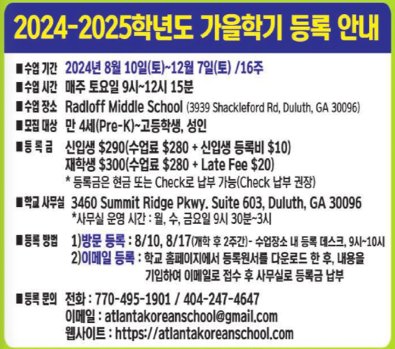 43년의 역사를 자랑하는 애틀랜타 한국학교가 가을학기 등록을 받고 있다. 수업은 10일부터 12월 2일까지 총 16주를 하며, 모집 대상은 만 4세부터 고등학생 및 성인까지다. 한국어를 처음 배우는 성인을 위한 반도 운영하고 있다. 한국학교 둘루스 사무실(3460 Summit Ridge Pkwy, Ste 603)을 방문해서 등록하거나 이메일로 할 수 있다. 홈페이지=atlantakoreanschool.com