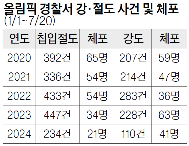 강도 사건도 마찬가지다. 범죄 건수는 지난 2020년부터 200건대를 유지하다 올해 100건대로 감소했다. 반면 강도 혐의로 체포된 용의자는 올해 41명으로, 지난 2022년(36명)에 이어 두 번째로 낮다.