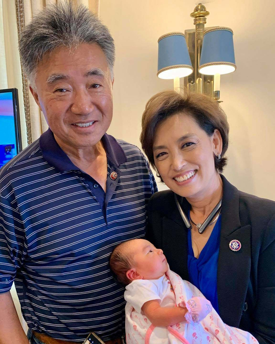 공화당 소속의 영 김 캘리포니아 39지구 연방하원 의원이 할머니가 됐다. 김 의원이 남편 찰스 김씨와 함께 갓 태어난 손녀를 안으며 활짝 웃고 있다. [영 김 의원 제공]