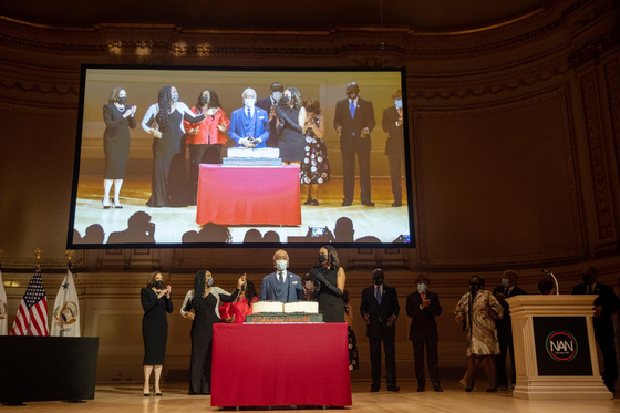 카멀라 해리스 부통령(왼쪽)이 1일 뉴욕을 방문해 맨해튼 카네기홀에서 열린 전국행동네트워크 창립 30주년 기념식에 참석해 연설했다. 이날 행사에서 알 샤프턴 목사(연단)가 기념 케이크를 커팅하고 있다. [로이터]