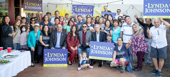 린다 존슨 LA카운티 셰리프 국장 보좌관은 지난달 21일 아트 카페에서 80여 명의 지지자가 모인 가운데 내년 4월 12일 열릴 선거 캠페인 킥오프 행사를 가졌다. 필리핀계인 존슨은 알렉스 비야누에바 LA카운티 셰리프 국장, 세리토스 시의회의 청 보 부시장, 나레시 솔란스키, 브루스 배로스 시의원, ABC교육구 유수연 교육위원장 등의 지지를 받고 있다. 존슨(맨 앞줄 왼쪽에서 네 번째 붉은 색 상, 하의) 후보가 지지자들과 함께 자리했다. [린다 존슨 캠프 제공]