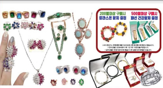 '반지천국'이 실시하는 파격 가격 세일 기간 동안 판매되는 칼라스톤 보석과 팔찌 제품, 그리고 게르마늄 팔찌 제품들. [반지천국]