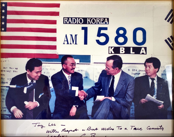 조지 부시 대통령이 한인타운을 방문해 피해 상황을 둘러봤다. 오른쪽부터 하기환 폭동피해대책위원장, 부시 대통령, 이장희 라디오코리아 대표, 데이비드 김 변호사. [하기환 회장 제공]