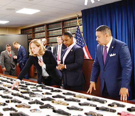멜린다 캐츠 퀸즈 검사장(왼쪽 세 번째)과 키첸 시웰 뉴욕시경(NYPD) 국장(왼쪽 네 번째)이 압수된 불법 총기류를 살펴보고 있다. [사진 퀸즈검사장실]