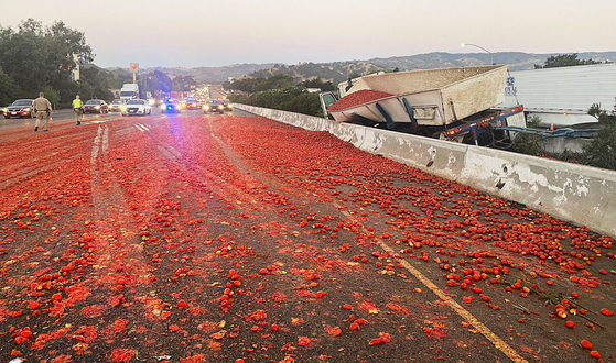도로 쏟아진 토마토 15만개 29일 오전 5시쯤 북가주 솔라노카운티 인근 80번 프리웨이에서 토마토를 실은 트럭이 중앙분리대와 충돌하며 약 15만개의 토마토가 도로에 쏟아졌다. 이로 인해 주행 중이던 차량 4대가 미끄러져 추돌사고를 내며 2명이 경상을 입었고, 주변 정리를 위해 임시 폐쇄된 도로는 이날 오후 3시에 다시 개통됐다. [솔라노카운티 트위터]