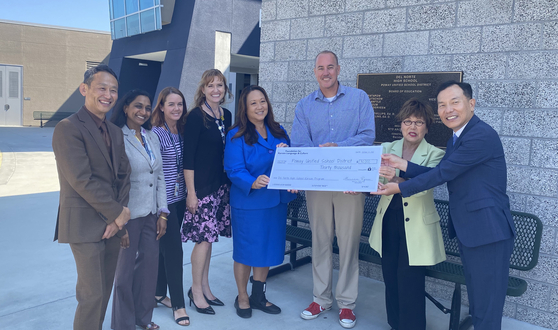 신주식 LA한국교육원장(왼쪽부터)과 모니카 류 한국어진흥재단 이사장이 브라이언 슐츠 교장과 매리앤 김 펠프스 교육감에게 한국어 과정 지원금 1만 달러를 전달하고 있다. 펠프스 교육감 왼쪽은 교육구의 주요 관계자들. [LA한국교육원 제공]