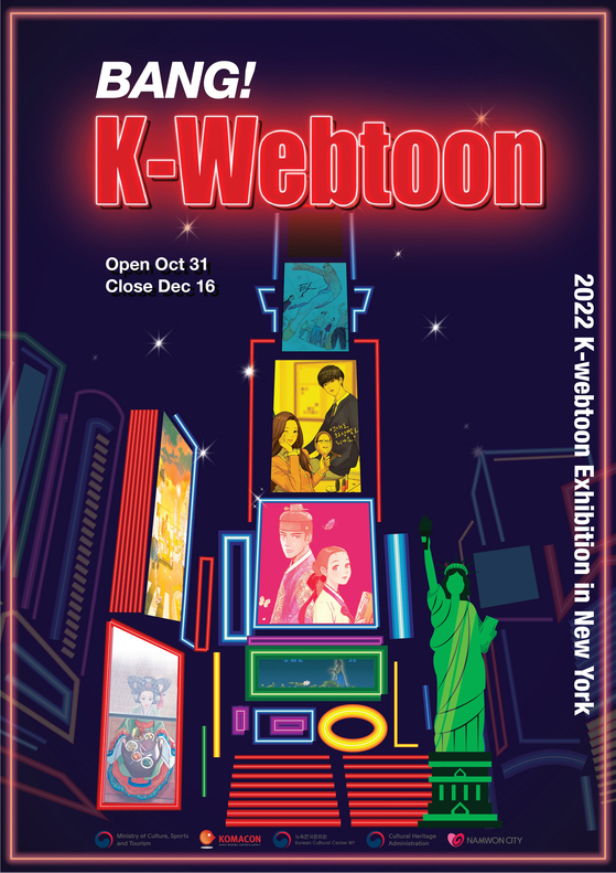 뉴욕한국문화원은 한국만화영상진흥원과 공동으로 한국의 대표 웹툰을 소개하는 전시 ‘Bang! K-webtoon’을 오(포스터)는 31일부터 12월 16일까지 뉴욕한국문화원에서 개최한다. 최근 인기를 끈 한국 드라마들 중 다수가 웹툰을 원작으로 한 경우가 많은 만큼, 이번 전시에서는 한국 드라마 원천 콘텐트로서 K-웹툰의 매력과 글로벌 영향력을 뉴요커들에게 직접 선보일 계획이다.