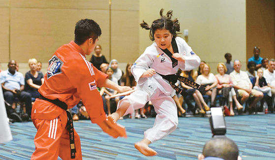 아시안을 겨냥한 증오 사건과 범죄가 증가했던 팬데믹 기간 플로리다주 웨스트팜비치에 위치한 '코리아 태권도'에는 태권도를 배우려는 중·고등학생들이 크게 늘었다. 도장에서 한 여학생이 날아차기를 하고 있다. [코리아 태권도 제공]