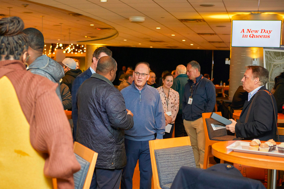 메츠 구단주 스티브 코헨(가운데)이 지난달 개최한 씨티필드 주차장 개발에 대한 커뮤니티 비전 세션(공청회)에서 참석자들과 이야기를 나누고 있다. [사진 퀸즈의 미래(queensfuture)]