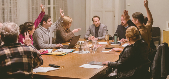 아버지의 재산을 물려받아 자신들을 사업가로 칭하는 체르마크 형제, 갓 이사 온 임신부와 그녀의 남편, 병원에 입원한 어머니 대신 한 표 행사를 위해 참석한 스벡 씨, 투자 가치를 높이기 위해 다락방 지을 공간을 더 확보하려는 니트란스키 씨, 모든 게 귀찮아 절차 진행에 무조건 반대만 하는 방해꾼 쿠밧 씨, 회의 내내 졸고 있는 재무담당 소콜 교수, 소련의 사회주의 시절이 더 좋았다고 불평만 늘어놓는 아파트 3채 소유주 밀로스 씨 등이 자리를 차지하고 있다.