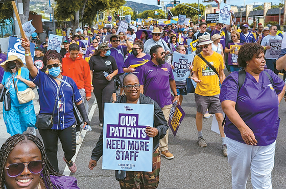 병원 체인인 카이저 퍼머낸테 노조 소속 노동자들 100여 명이 4일 오전 근무 환경 개선과 추가 고용을 요구하며 LA 다운타운 인근에서 행진을 벌이고 있다. LA경찰국은 이날 일부 거리를 불법 점거한 시위대를 해산하는 과정에서 23명을 연행했다고 밝혔다.