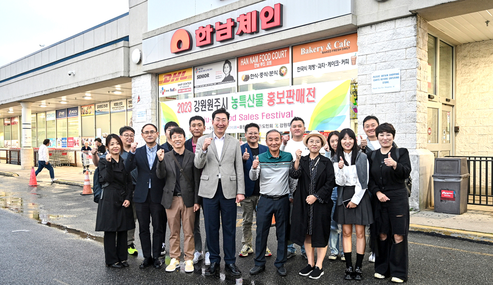 미국시장 개척을 위해 미국을 방문한 대한민국 강원도 원주시 방미 대표단은 지난 7일 뉴저지주 포트리에 있는 한남체인 특판 행사에 참석해 특별 판촉을 펼쳤다. 원강수 시장 등 방미 대표단은 지난 6일 뉴욕시 퀸즈 아드리아호텔 앤드 콘퍼런스센터에서 진행한 수출상담회에서 534만 달러의 계약을 성사시켰다. [강원도 원주시]