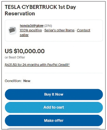 테슬라 전문매체 테슬라라티에 따르면 테슬라 사이버트럭 예약권이 이베이에서 5000달러에서 1만 달러 사이에 경매로 판매되고 있다. 사이버트럭 예약권의 원가가 100달러였던 것과 비교하면 최대 100배가 급등한 것이다.