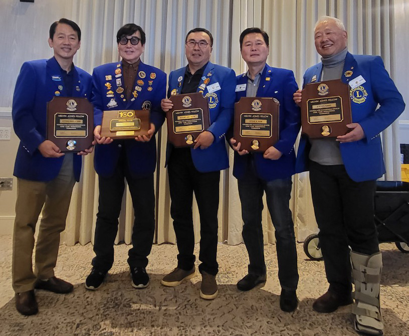 OC한인라이온스클럽(회장 박경모)이 지난 9일 부에나파크의 나츠베리팜 호텔에서 열린 디스트릭트 시상식에서 멜빈 존스상을 받았다. 라이온스클럽을 창설한 멜빈 존스의 이름을 딴 이 상은 커뮤니티 봉사에 현저한 공을 세운 이들에게 주는 권위 있는 상이다. 왼쪽부터 한경욱 골프위원장, 존 하 시니어위원장, 박경모 회장, 스티브 남 봉사위원장, 스티브 강 총무. 또 다른 수상자인 잔 이 재무는 시상식에 참석하지 못했다. [OC한인라이온스클럽 제공]