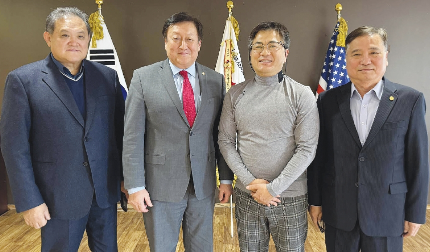 박준서 제과명장이 뉴욕·뉴저지 진출을 앞두고 22일 뉴욕한인회를 찾았다. 김광석 뉴욕한인회장은 “한국 명장의 빵을 미국에서 맛 볼 수 있게 돼 참으로 반가운 마음”이라며 “K-베이커리의 진면목을 보여주길 바란다”고 격려했다. 왼쪽부터 이강원 뉴욕한인회 이사장, 김광석 회장, 박준서 명장, 류제봉 뉴욕한인회 이사. [사진 뉴욕한인회]