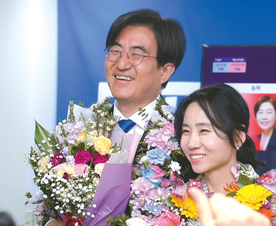 제22대 국회의원 선거 경기 고양갑에 출마한 더불어민주당 김성회 후보(왼쪽)가 11일(한국시간) 오전 자신의 선거 사무소에서 당선 확실 소식에 활짝 미소 짓고 있다. [연합]