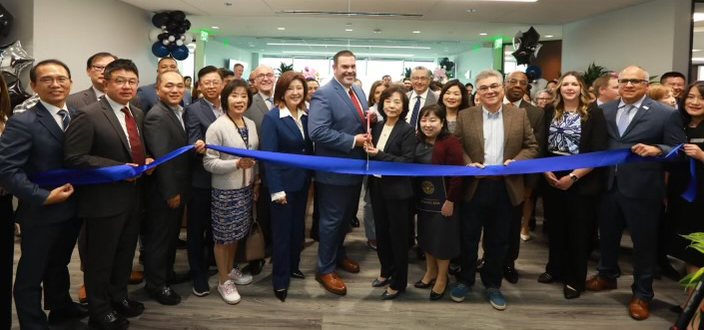 뉴욕라이프 애너하임 지사 그랜드 오프닝 행사에서 유진 럿츠(가운데 붉은 색 넥타이) 서부 담당 부사장과 섀리 린(럿츠 부사장 오른쪽) 지사장이 주요 하객과 리본 커팅을 하고 있다. [뉴욕라이프 제공]