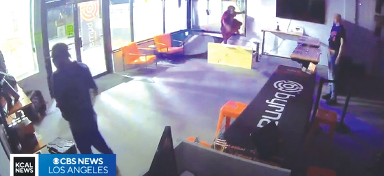 26일 밴나이스 지역 호신용품 업소 '바이르나' 딜러숍에 절도범들이 유리창을 깨고 침입하고 있다. [CBS 화면 캡처]