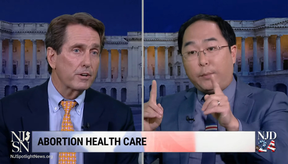 앤디 김 연방하원의원(민주·뉴저지 3선거구, 오른쪽)이 지난 15일 NJ스포트라이트 뉴스와 뉴저지주 PBS 주최로 열린 2차 토론회에서 공화당 커티스 버쇼(왼쪽) 후보에게 ″내 말을 끝내게 두라″고 경고하고 있다. 한편 그의 넥타이가 때아닌 ‘북한 인공기’ 논란을 불러 일으켰고, 김 의원은 “역겨운 인종차별”이라 맞섰다. [NJ스포트라이트 뉴스 유튜브 캡처]