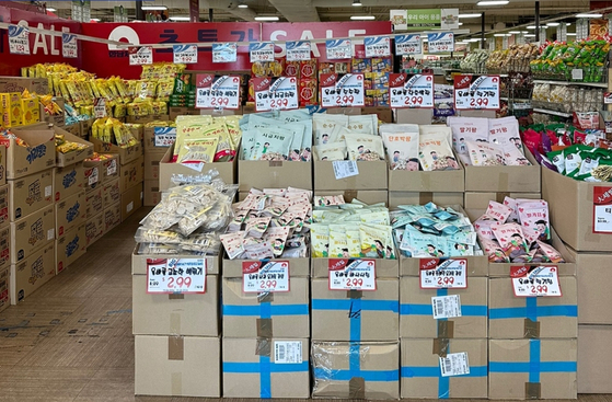 한남체인 풀러튼 매장에서 판매되고 있는 독도 쌀과자 제품들. [올바름 제공]
