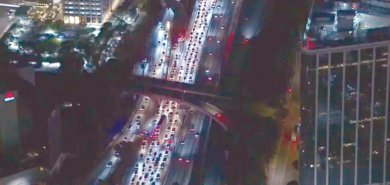 12일 새벽 110 프리웨이 북쪽 방향 차선이 사고로 인해 극심한 정체를 빚고 있다. [KTLA캡처]