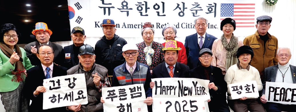 뉴욕한인상춘회는 23일 플러싱 산수갑산2 식당에서 신년하례식 및 1월 월례회를 열었다. 이영우 회장(앞줄 오른쪽 네 번째) 등 참가자들이 현운 박원선 국전 초대작가가 쓴 붓글씨를 들고 인사하고 있다. [뉴욕한인상춘회]