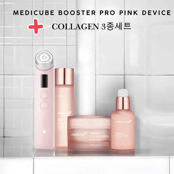 부스터 프로는 메디큐브 콜라겐 3종 세트와 함께 사용하면 더욱 드라마틱한 효과를 얻을 수 있다. 메디큐브 3종 세트는 속부터 차오르는 콜라겐 물광의 힘을 선사하는 콜라겐 토너와 세럼, 젤크림으로 구성되어 있다.