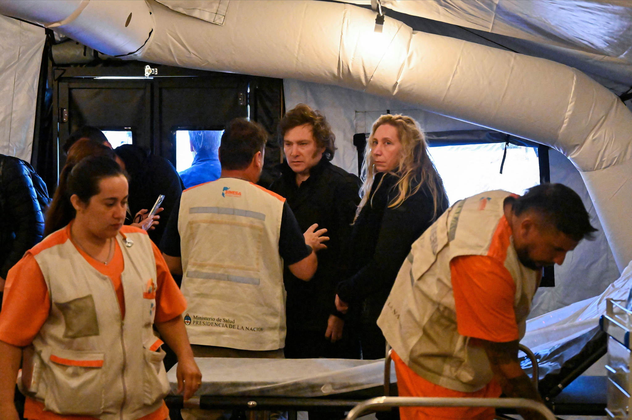 3월 12일 밀레이 대통령과 카리나 대통령 비서실장이 부에노스아이레스주 바이아 블랑카시의 홍수 피해 지역에 설치된 임시 병원 텐트 안에서 한 남성과 대화하고 있다. [로이터]