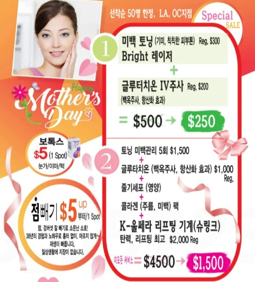 39년 전통의 '소호메디스파'에서는 가정의 달 특별 세일의 일환으로 기미와 칙칙한 피부톤에 최적화된 미백 토닝 레이저와 항산화 효과의 '백옥주사'로도 유명한 글루타치온 IV 주사 패키지를 반값인 250달러에 세일하고 있다.