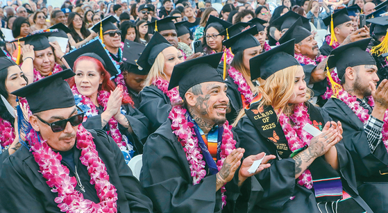 홈보이 인더스트리의 졸업생들이 21일 LA 다운타운 본사에서 열린 졸업식에 참석해 박수를 보내고 있다. 홈보이는 전 갱단원과 교도소 출소자들의 재활과 자립을 지원하는 세계 최대 규모의 비영리기관이다. 이날 행사에는 직업훈련 프로그램을 수료한 참가자와 커뮤니티 클라이언트, 현직 직원 등 109명이 참석했다. 졸업생들은 UCLA, UC버클리, USC 등에서 학위를 받거나 고등학교 졸업장을 취득했다. 김상진 기자