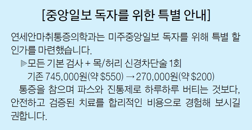 미국에 거주하는 한인 환자의 현실도 이와 크게 다르지 않다. 의료비는 비싸고 진료 예약은 몇 달씩 밀려 있다 보니, 통증이 있어도 제대로 치료를 받지 못한 채 임시방편으로 버티는 경우가 많다.