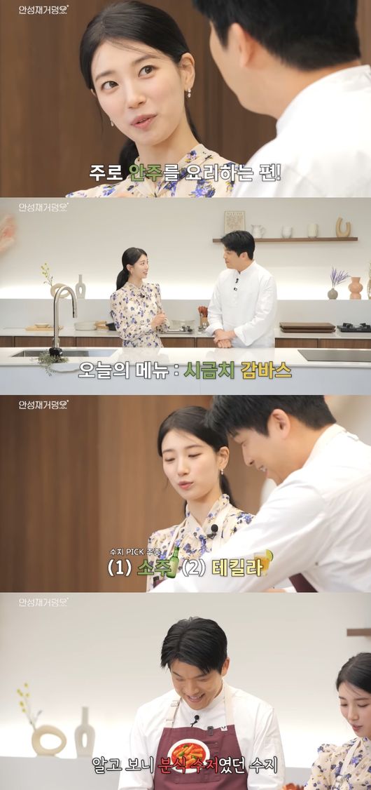 수지는 “평소에 안주를 많이 해 먹는 편이다. 술을 좋아해서”라며 “한식도 하고 강된장, 떡국 등 직접 만든다”라고 애주가 면모를 드러냈다. 이를 들은 안성재가 “나름 되게 실력이 있으신?”이라고 놀라자 수지는 “근데 저는 시판 소스를 쓴다. 그래서 좀 추가를 하기도 하고”라고 솔직하게 털어놨다.