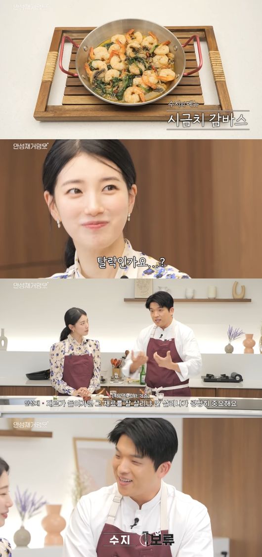 그러면서도 그는 “근데 수지님이 아까 다진 걸 넣을 때 편마늘 넣을걸 할 걸 그랬네 하더라. 그래도 이해를 하시고 요리하는 것 같고”라며 “수정한 걸 보고 나니까 오늘 이 감바스는 보류”라고 덧붙였다. 이를 들은 수지는 “탈락은 아니네요”라고 안도했다.