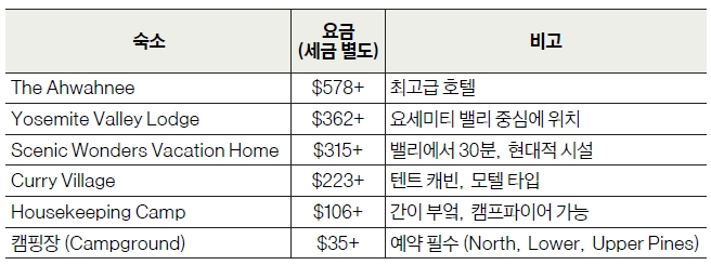 숙박 가이드요세미티 국립공원은 다양한 숙박 옵션이 있다.