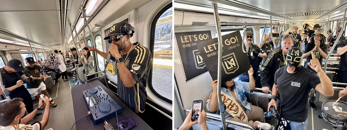 BMO 스타디움으로 향하는 메트로 지하철에서 LAFC 팬들이 ‘화이팅 가자’라는 한글 문구를 들고 손흥민 선수를 응원하고 있다.