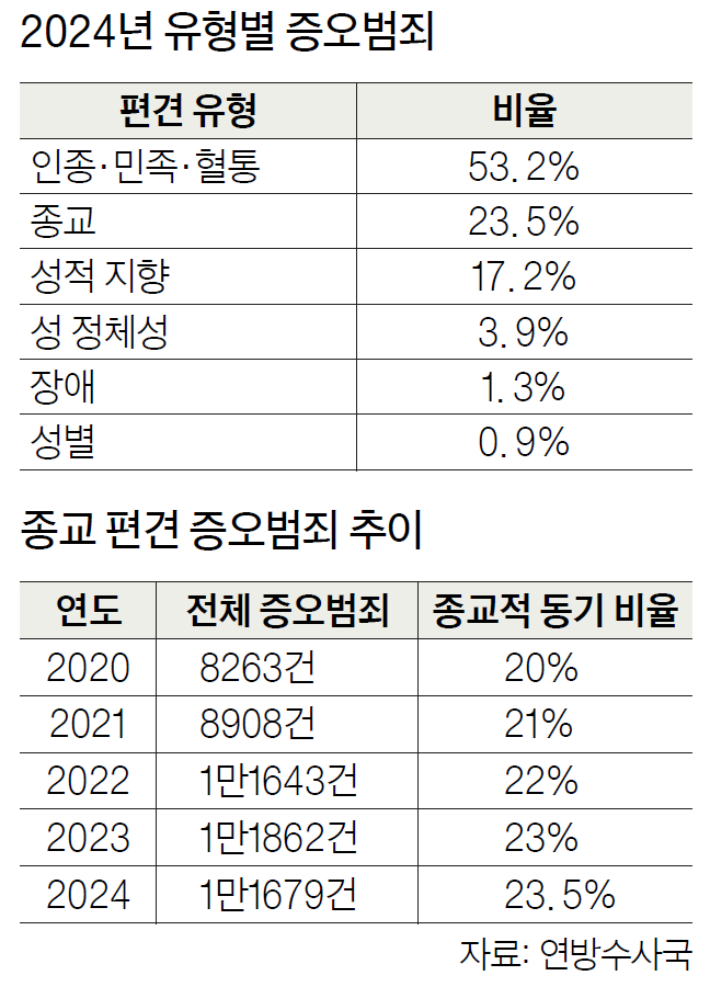 지난해 증오범죄의 편견 유형을 보면 인종.민족.혈통이 53.2%로 가장 많았고 종교가 23.5%로 그 뒤를 이었다. 이어 성적 지향(17.2%), 성 정체성(3.9%), 장애(1.3%), 성별(0.9%) 순으로 나타났다.