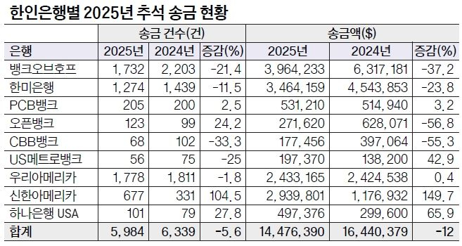 US 메트로뱅크는 지난해 75건의 송금으로 총 13만8200달러를 한국으로 보냈는데, 올해는 56건으로 줄었다. 다만 송금 총액은 늘어 총 19만7370달러를 기록했다.