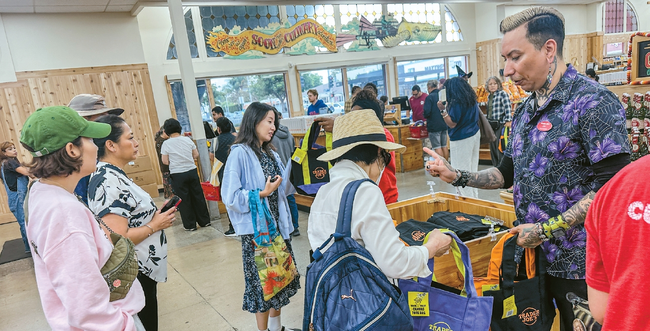 8일 오전 9시쯤 LA 한인타운 인근 3가와 라브레아 애비뉴 인근 트레이더조 매장에서 고객들이 새로 출시된 핼러윈 미니 토트백(개당 2.99달러)을 고르고 있다. 지난해 조기 품절로 화제가 된 미니 토트백은 올해 블랙·오렌지·퍼플 등 핼러윈 대표 색상으로 다시 출시돼 인기를 끌고 있다. 매장 앞에는 영업 시작 전부터 긴 줄이 형성됐으며, 업체는 한 사람이 색상별로 4개 한 세트만 구입할 수 있도록 제한했다.