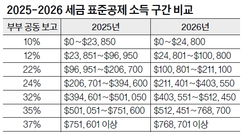 국세청(IRS)이 인플레이션 영향을 반영해 2026년도 신규 소득세율 구간과 변경된 표준공제액(Standard Deduction)을 9일 발표했다.