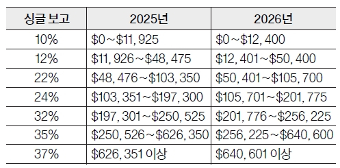 예를 들면 2025년에 연소득 5만 달러의 싱글 납세자는 최고 22% 세율이 적용됐지만, 2026년에는 오히려 같은 소득에 대해 최고 12% 세율만 적용된다. 〈표 참조〉